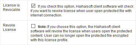 If you choose this option, the Haihaisoft client software will revoke the license when users open the protected content. User can no longer open the protected file encrypted with this license profile.