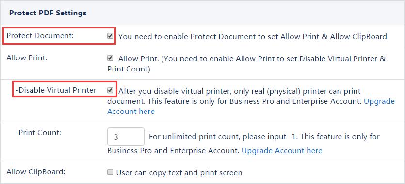 Please select Check "Protect Document" option. If you allow your clients to print PDF, we highly recommend that you select "Disable Virtual Printer" option and set limited "Print Count". Please don't select "Allow Clipboard" option.