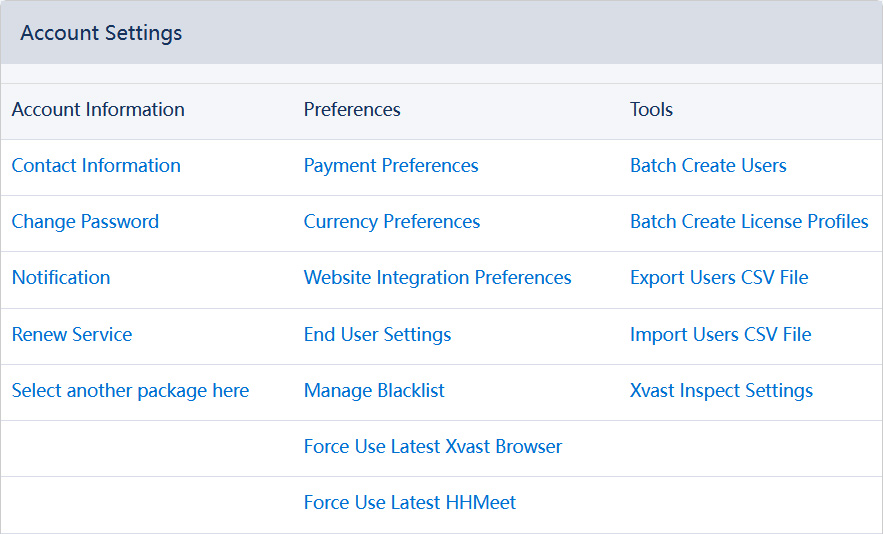 The more commonly used preferences settings include payment preferences, website integration preferences, end user settings, force use latest Xvast browser.