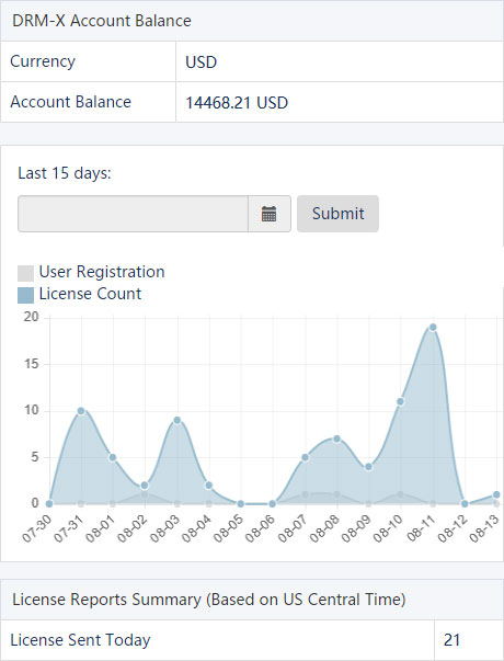 The DRM-X 4.0 encryption platform provides comprehensive report information. Through the report, you can see the user registration amount, license delivery amount, license reports summary, financial reports summary, and add fund history of your account.